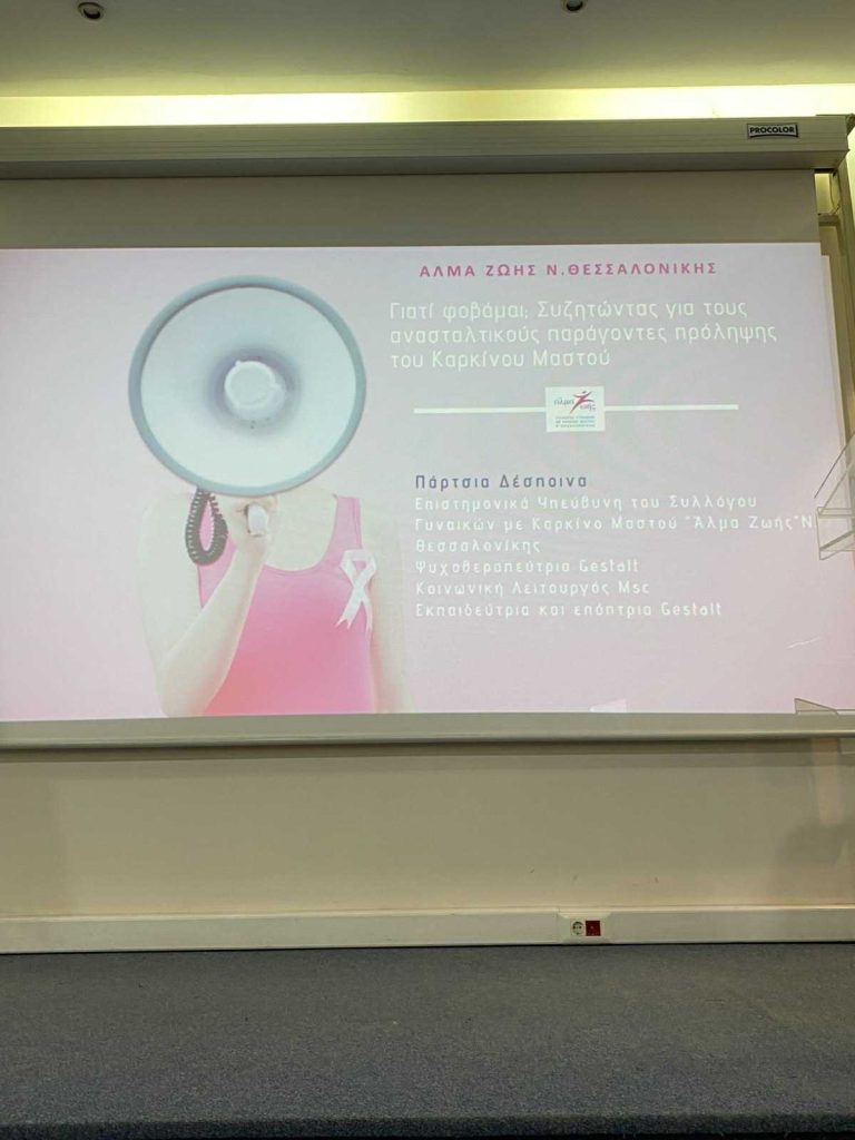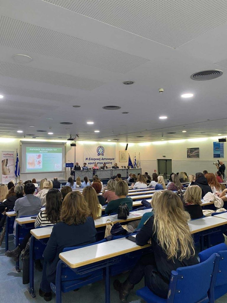 Με μεγάλη επιτυχία και συγκινητική προσέλευση, πραγματοποιήθηκε την Τρίτη 4 Νοεμβρίου 2025 η Ενημερωτική Ομιλία Πρόληψης και Έγκαιρης Διάγνωσης για τον Καρκίνο του Μαστού, που διοργανώσαμε από κοινού με την Ένωση Αστυνομικών Υπαλλήλων Θεσσαλονίκης, στην αίθουσα Αμφιθεάτρου του Αστυνομικού Μεγάρου Θεσσαλονίκης (Α.ΜΕ.Θ.).