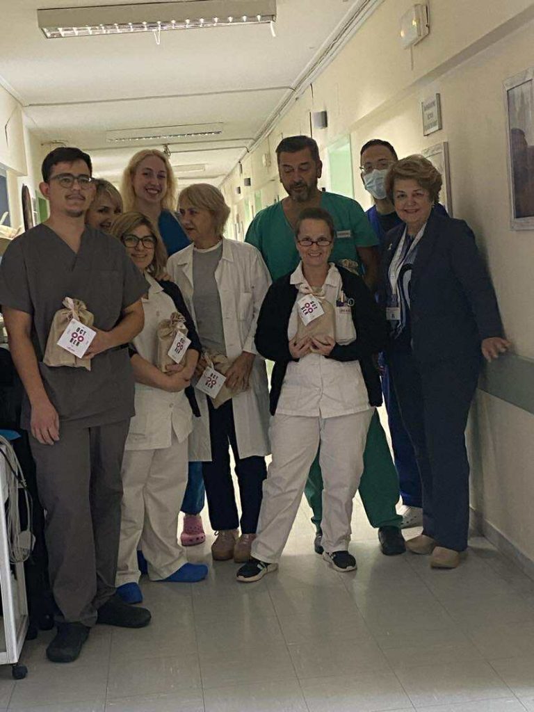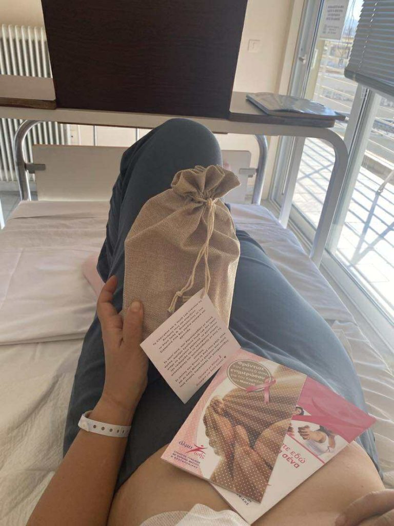 Η Επίτιμη Πρόεδρος του Συλλόγου μας, κ. Ελένη Ντελιοπούλου, γυναίκα που κι η ίδια έχει βιώσει την εμπειρία Καρκίνου του Μαστού, επισκέφτηκε τα δωμάτια τους, συνομίλησε μαζί τους, βρέθηκε κοντά στις ασθενείς και μέσα από το κοινό βίωμα στήριξε τις γυναίκες που νοσηλεύονται, ενώ τις πρόσφερε εκ μέρους όλων μας στο Σύλλογο, τα υπέροχα πουγκιά Cherrybox ως ένδειξη αγάπης και φροντίδας!