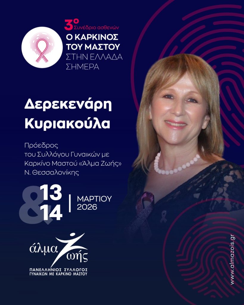 Η Πρόεδρος του Συλλόγου μας, κ. Κυριακούλα Δερεκενάρη, θα συντονίσει μαζί με την κ. Ειρήνη Θρουβάλα την ενότητα «Ποιότητα Ζωής – Survivorship», μια συζήτηση αφιερωμένη στη ζωή μετά τη διάγνωση και τη σημασία της ουσιαστικής στήριξης των γυναικών σε κάθε στάδιο της διαδρομής τους.
